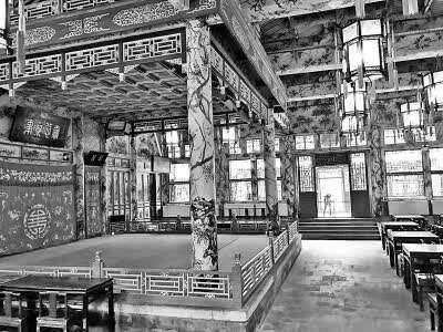 我们并没有许多时间一一细看,但我知道,东西两路曾自有其四合院的格局。东路前院正厅名“多福轩”,后院正厅名“乐道堂”;西路前院正厅名“葆光室”,后院正厅“锡晋斋”为七开间带抱厦,室内以楠木装修隔断和暗楼。这锡晋斋前的垂花门,上有书“天香庭院”的匾额一方。三路院落北面,则是两层后罩楼。