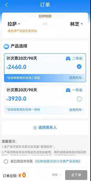 旅客可在铁路12306网站和铁路12306APP上购买计次票产品,在90天有效期内,最多可乘坐20次拉林铁路和兰新高铁指定发到站和席别的动车组列车,票价按所有车次同席别实行相应的折扣优惠。