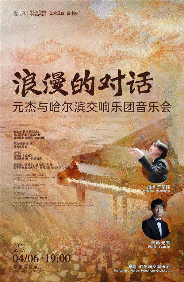 4月6日19时上演的“浪漫的对话——元杰与哈尔滨交响乐团音乐会”由国家一级指挥、哈尔滨交响乐团副团长、常任指挥于学锋执棒,特邀联合国青年艺术大使、哈尔滨音乐学院钢琴系主任、教授、硕士生导师元杰担任钢琴独奏。除了《蓝色狂想曲》和钢琴协奏曲《黄河》两部脍炙人口的钢琴作品外,还将奏响《第九交响曲“自新大陆”》和交响曲《长城》。