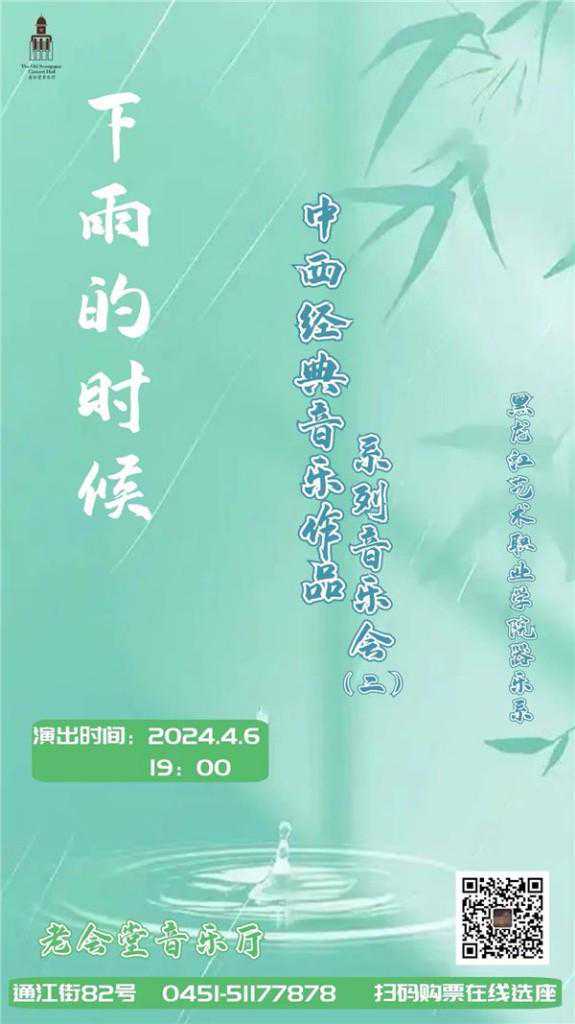 4月6日19时,“下雨的时候”中西经典音乐作品系列音乐会也将与乐迷在老会堂音乐厅见面。本场演出由黑龙江艺术职业学院器乐系室内乐团担任演奏,《D大调嬉游曲拉罗》《d小调大提琴协奏曲》《渭水情》《二泉戏舞》《查尔达什》等中外经典音乐作品,将带领乐迷领略春意盎然的美好胜景。