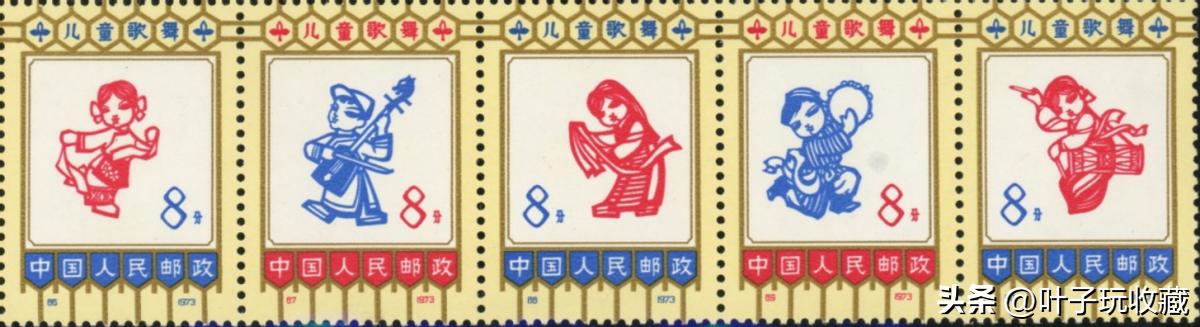编86-90儿童歌舞由吴建坤设计,于1973年6月1日发行。其是一套连票,全套5枚,全张50枚,5枚连印,发行量1000万套。