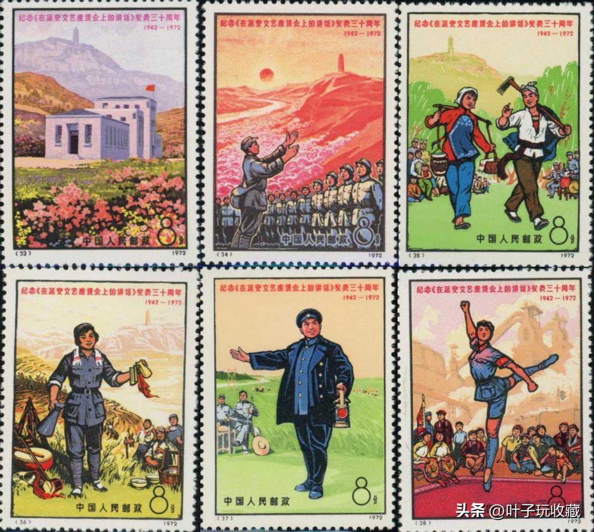 编33-38纪念《在延安文艺座谈会上的讲话》发表30周年由许彦博、张克让、张源、杨白子、李印清共同设计,于1972年5月23日发行。全套6枚,全张为28枚,发行量700万套。