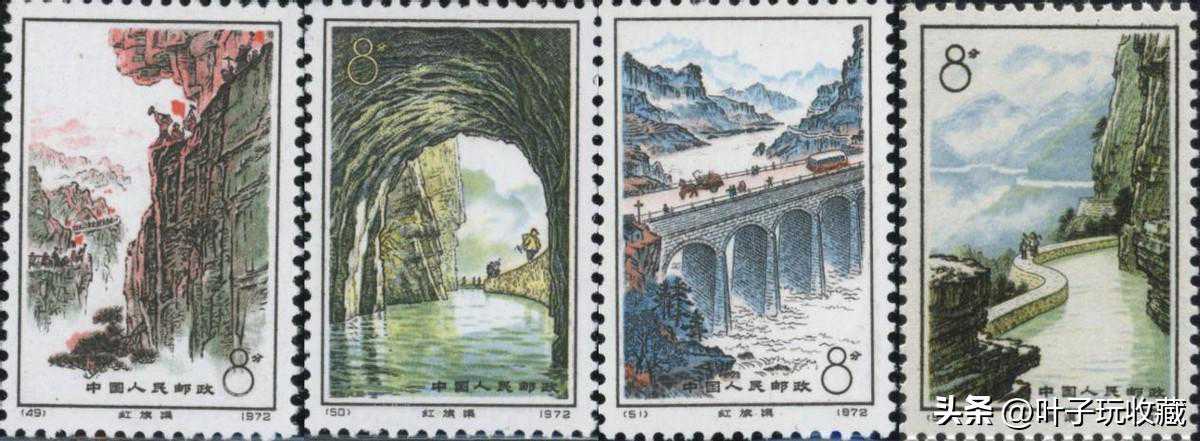 编49-52红旗渠有杨白子,徐艳博共同设计。1972年12月30日发行。全套4枚,全张56枚,为愚公移山、青年洞、桃园桥、人间天河,发行量770万套。