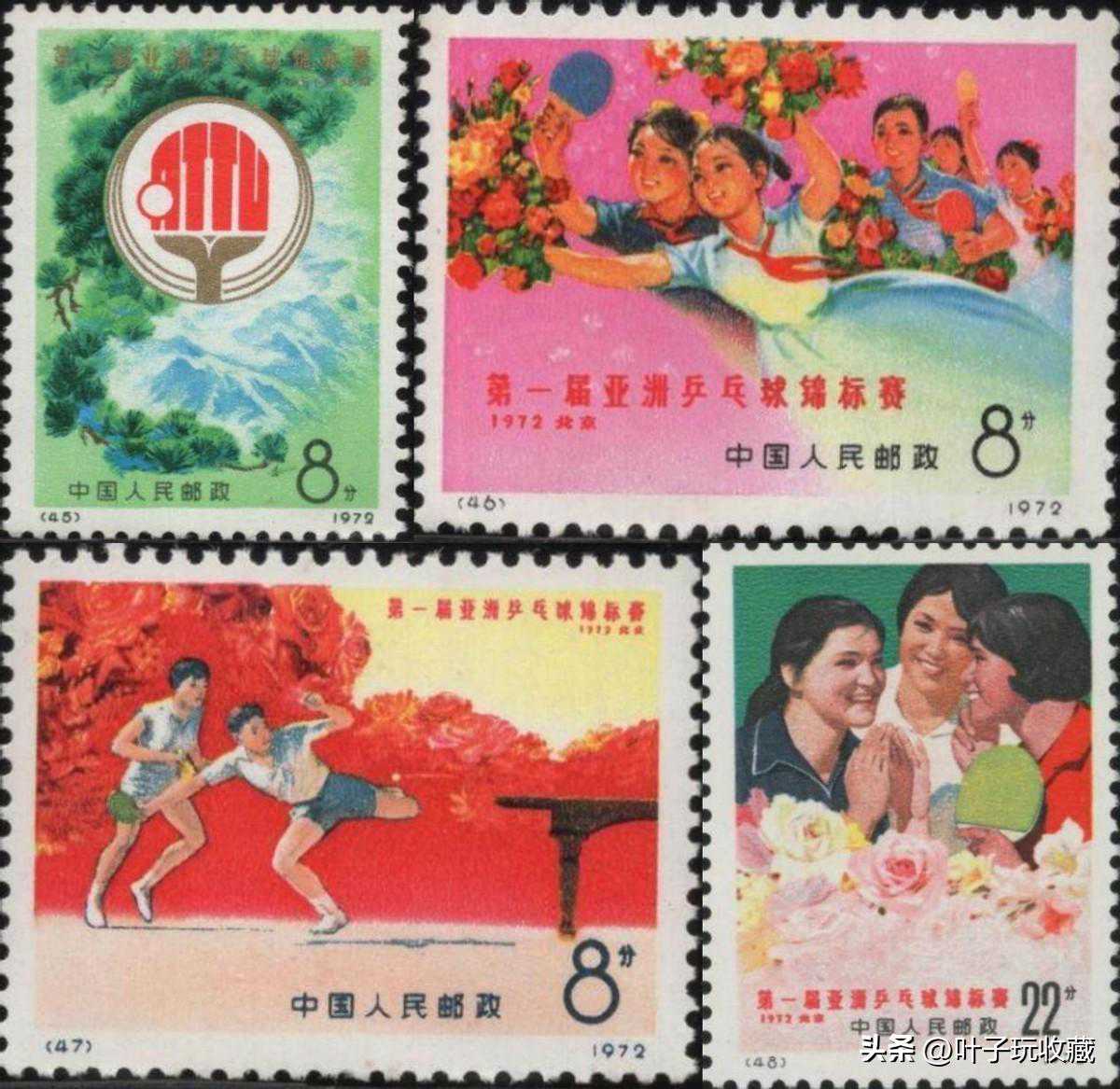 编45-48第一届亚洲乒乓球锦标赛由杨白子、吴敏共同设计,1972年9月2日发行。全套4枚,全张为50枚,影写版,发行量300万套。