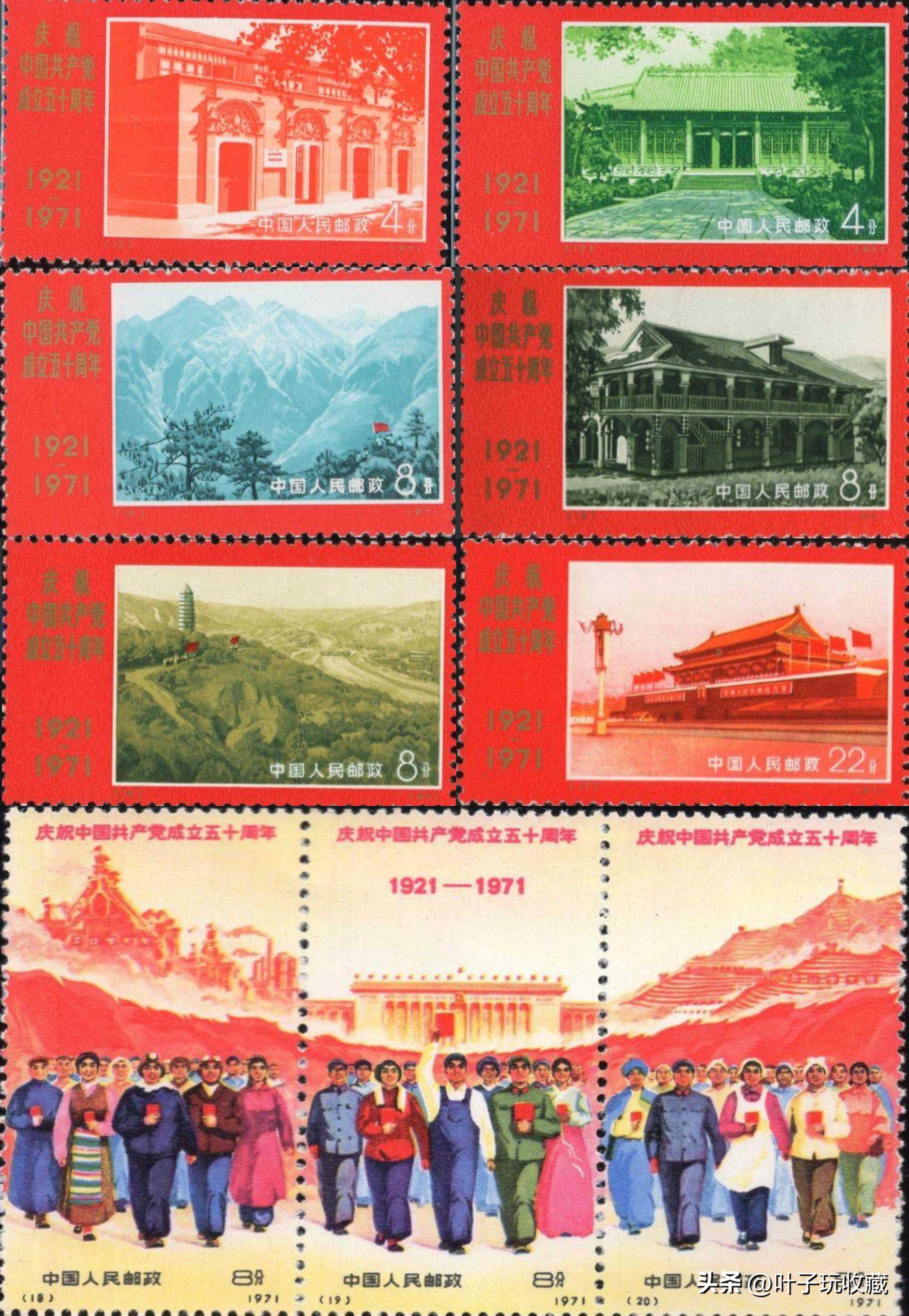 编12-20庆祝中国共产党成立50周年由许彦博、张克让共同设计,1971年7月1日发行。全套9枚,全张有两种规格,为36枚、40枚,其中18-20号邮票连印,总发行量320万套。
