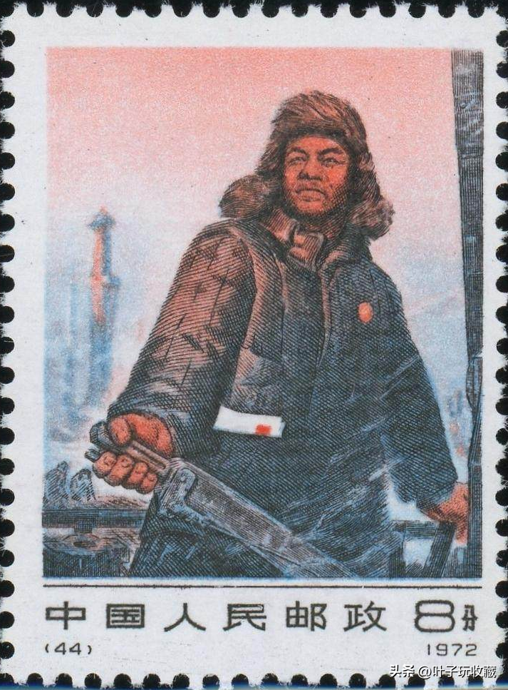 编44中国的工人阶级的先锋战士-铁人王进喜其由孙鸿年设计,于1972年12月25日发行,单枚,全张为50枚,影雕套印,发行量1000万枚。