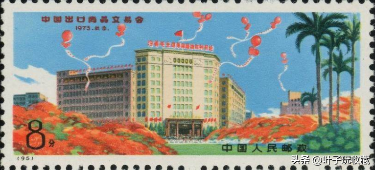 编95中国出口商品交易会由杨白子设计,于1973年10月15日发行。单枚,全张40枚,发行量400万枚。