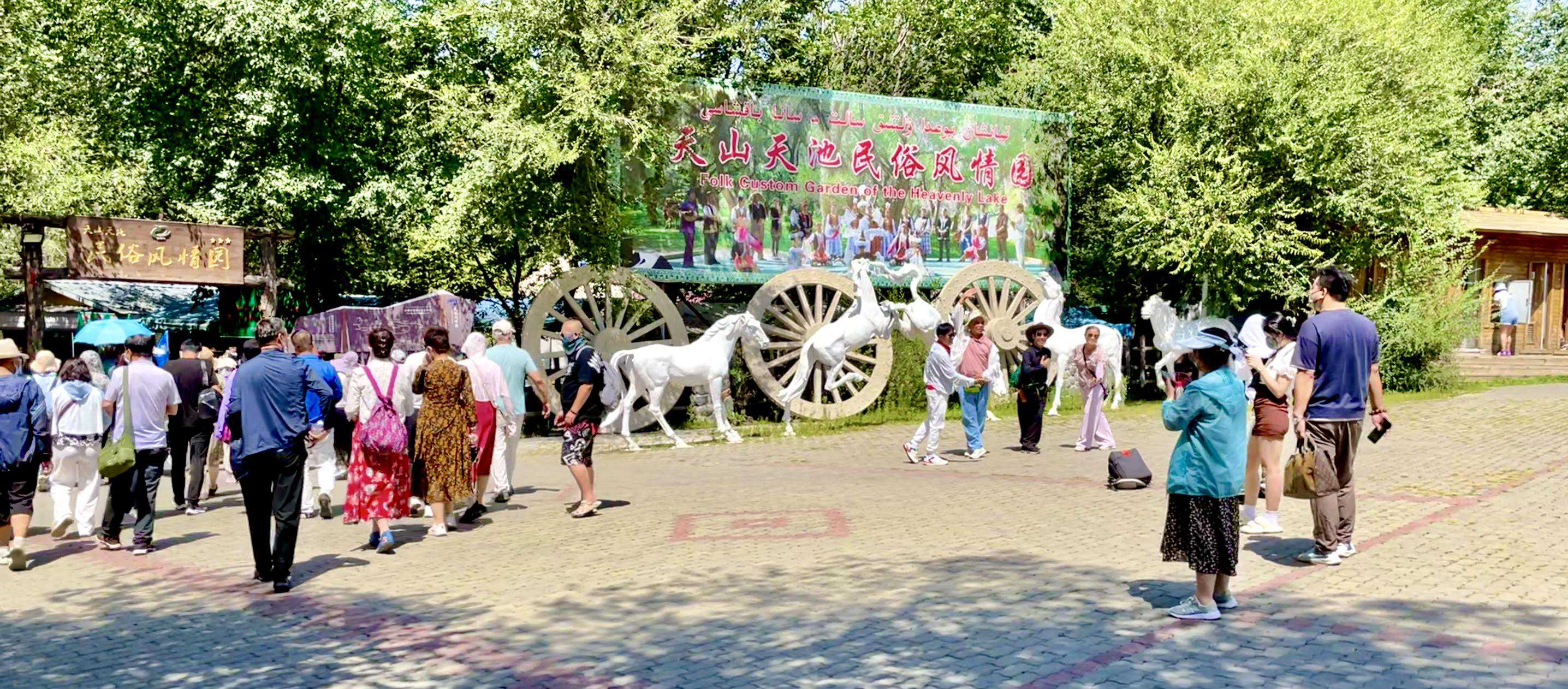 区间车停靠第一站,是天山天池民俗风情园,位于天山天池景区内阔克胡拉村。这里集民俗风情、特色美食于一身,每个路口配备专业讲解员,还可以与舞蹈演员一起演绎民族舞蹈,充分体验哈萨克民族风情。