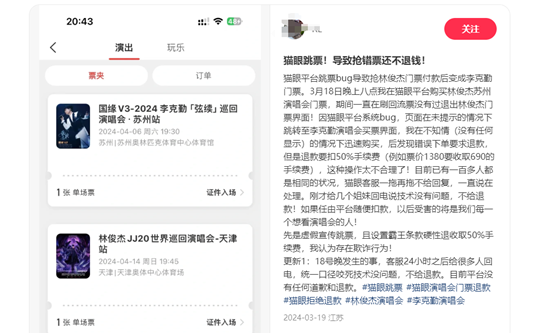 起初,她以为是自己“不小心”买错了票,可在社交平台上一搜,发现和自己同样在猫眼上买票、同样“买错”成李克勤的消费者还有不少,这是巧合吗?他们拉起了维权群,三天时间群里已经聚集了100多人。