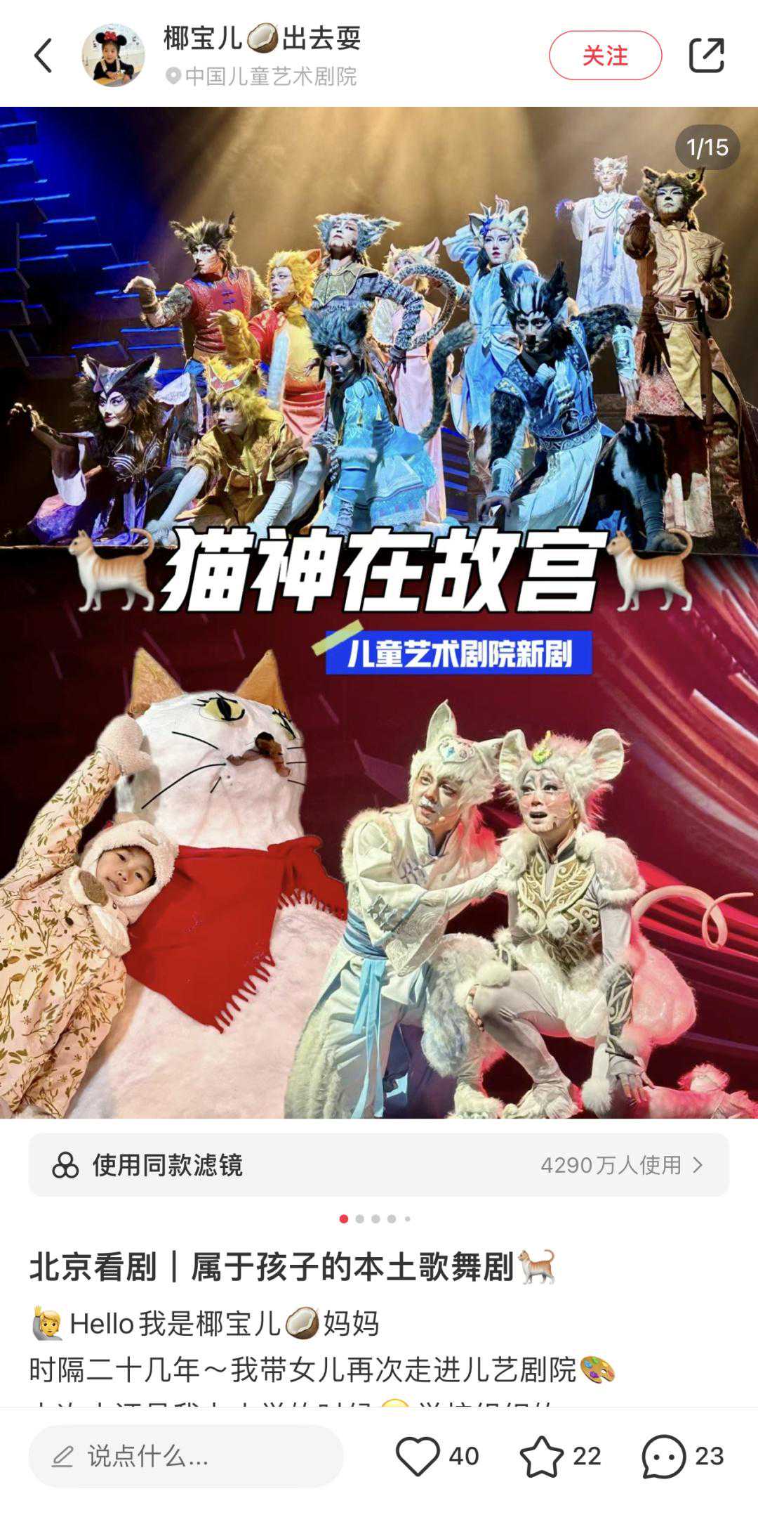 《猫神在故宫》是儿童歌舞剧的顶尖之作!这部剧让我看得很惊喜,剧中的猫咪不一般,它心中有爱,愿意帮助别人,并且不怕困难。“人与自然,和谐共生”的主题,让爱动物的人和给人带来回报的动物双向奔赴!剧中还有厚重的历史,有温暖的爱国情怀。李海鹰老师的歌曲,旋律优美、容易传唱。此次中国儿童艺术剧院和故宫博物院的强强合作,真正使儿童艺术的舞台与传统文化完美结合,让文物活起来。