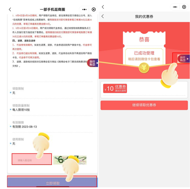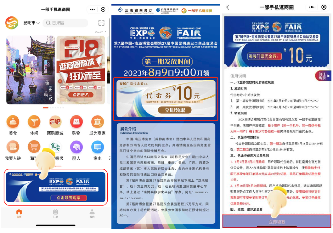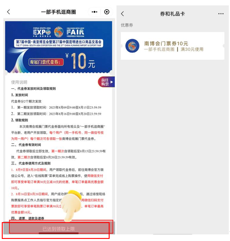 本次南博会门票代金券面向“一部手机逛商圈”平台新、老用户开放领取,每个用户(同一手机号、同一微信号视为同一用户)每个期次可各领取一张南博会门票代金券。