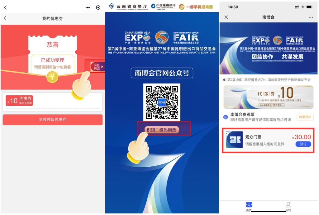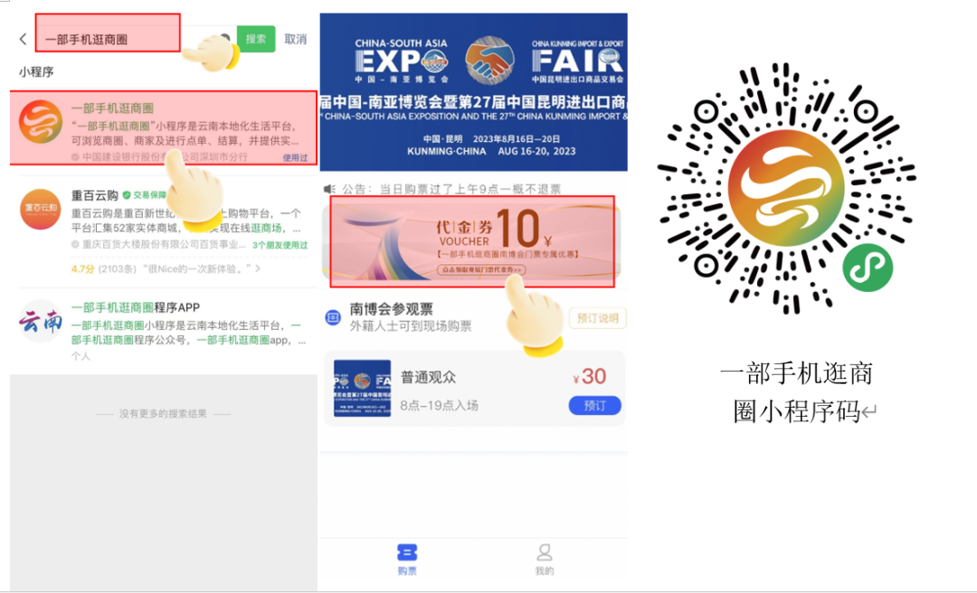 目前,大家可通过微信搜索"南博会"公众号、"中国南亚博览会EXPO"公众号、"云品荟"公众号,找到购票入口直接购票。也可登录南博会官方网站、南博会官方APP,或微信搜索"南博会"官方小程序、"一部手机云品荟"官方小程序,找到购票入口购票。