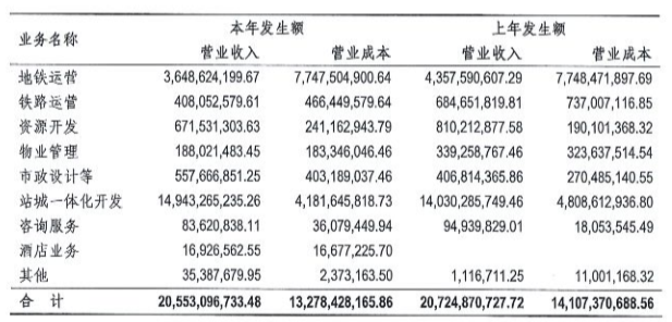 深圳地铁2020年主营业务表。