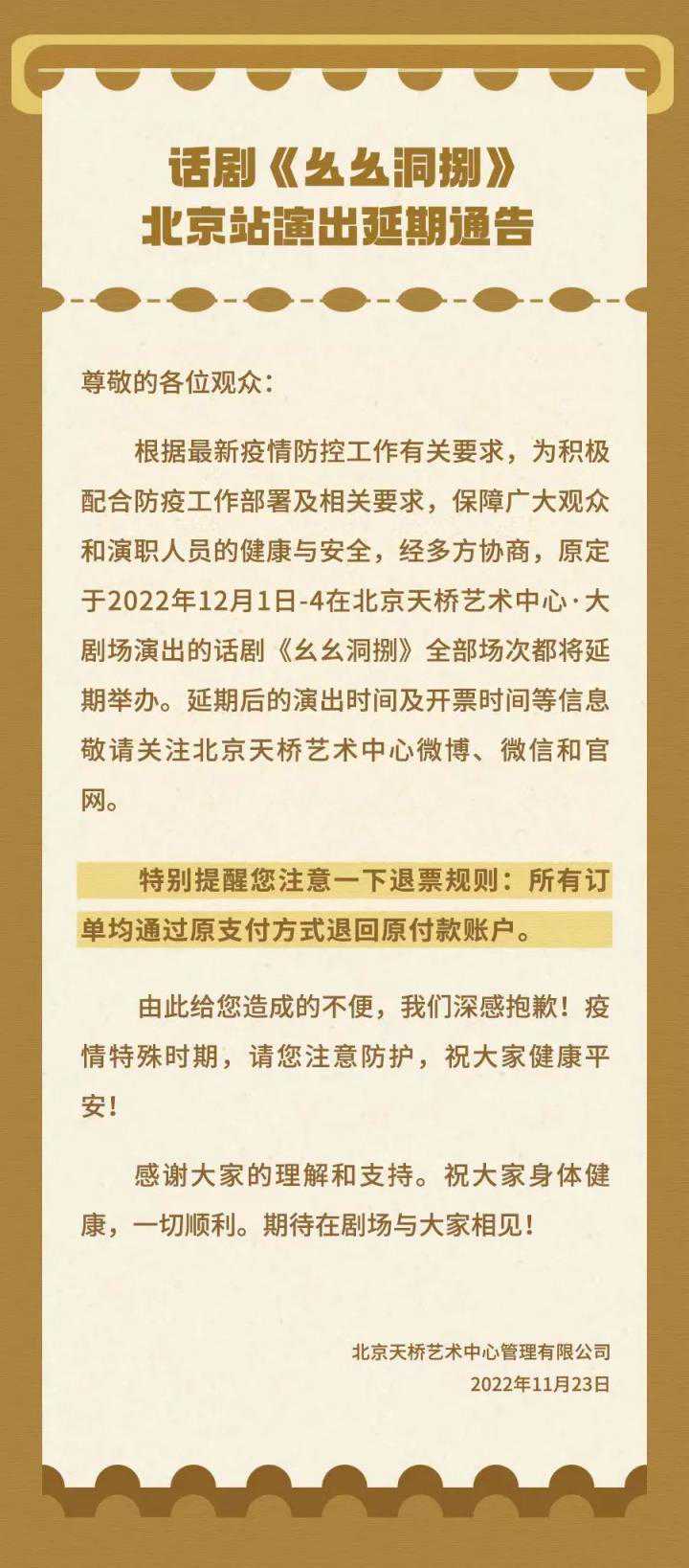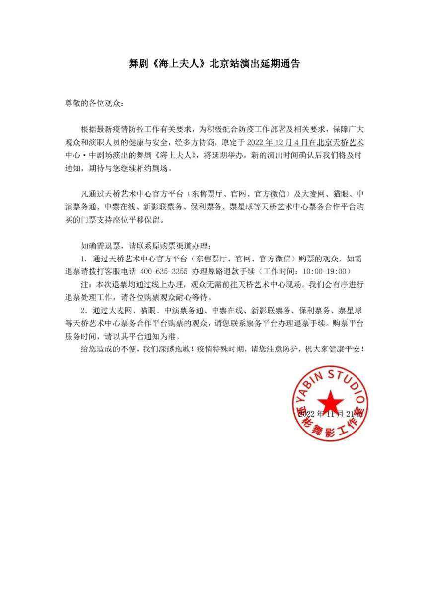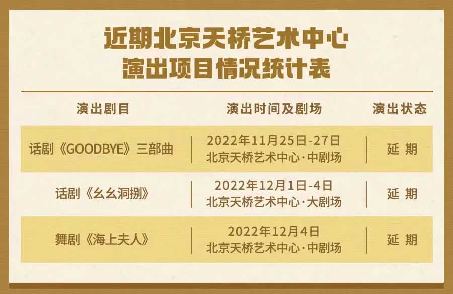 根据最新疫情防控工作有关要求,为积极配合防疫工作部署及相关要求,保障广大观众和演职人员的健康与安全,经多方协商,我们很抱歉地通知您,原定于2022年11月25日—12月4日在北京天桥艺术中心举办的部分演出将延期或取消。由此给您带来的不便我们深表歉意,感谢您的理解与支持!