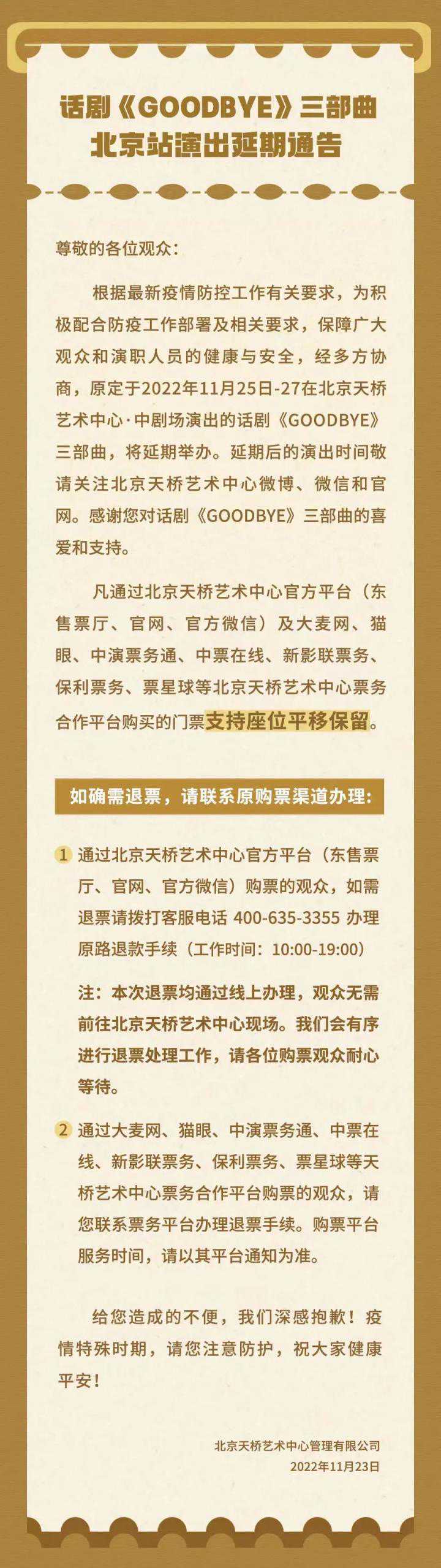 注:本次退票均通过线上办理,观众无需前往北京天桥艺术中心。由于订单量大,我们会有序进行退票处理工作,请各位购票观众耐心等待。