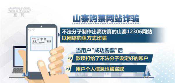 山寨购票网站诈骗:不法分子制作出高仿真的山寨12306网站,以网络钓鱼方式诈骗,这些网站在页面布局、域名上与12306网站非常相似。当用户“成功购票”后,款项打给了不法分子设定好的账户,用户个人信息也被盗取。