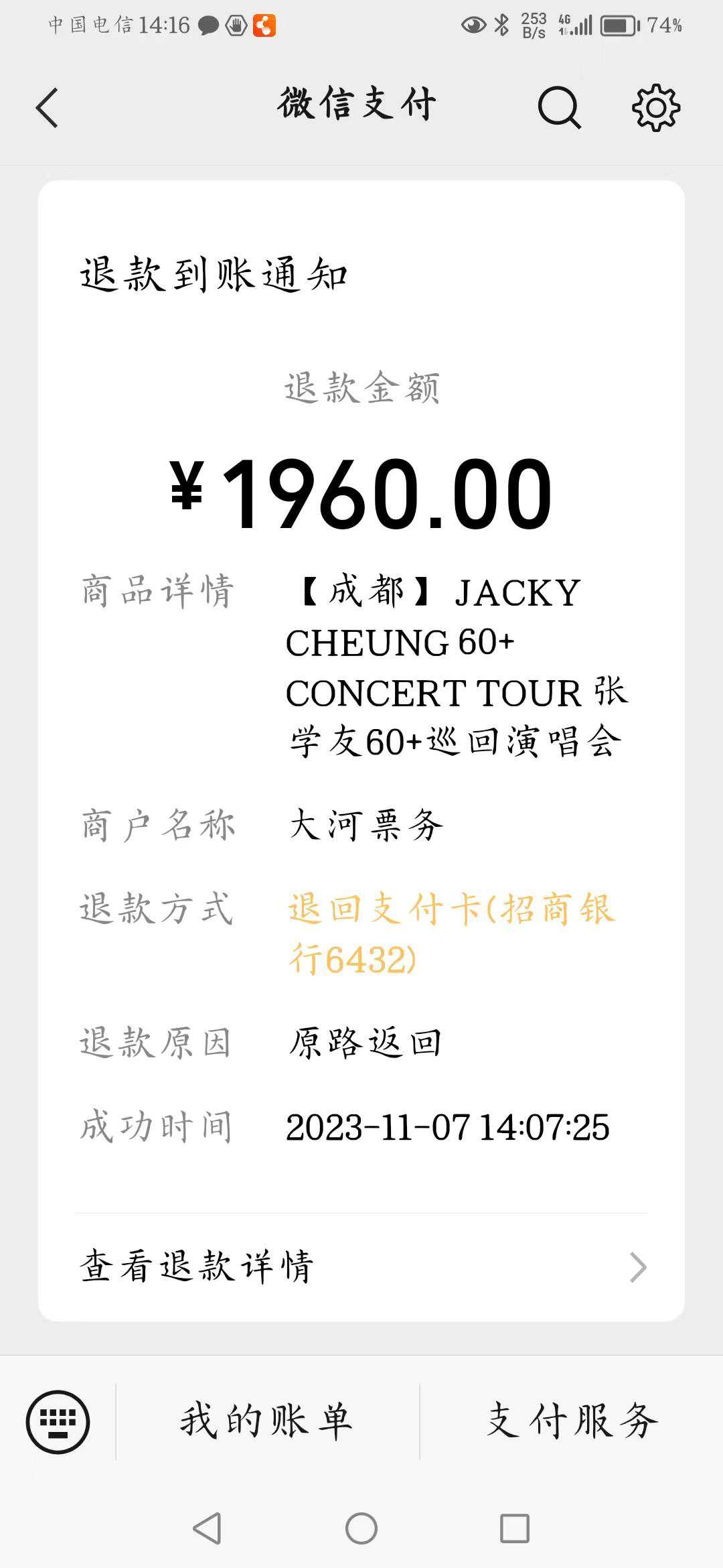 11月7日,消费者朱女士向澎湃质量观投诉平台反映,2023年8月11日,她在大河票务官网购买了十月份的张学友成都演唱会门票,共计1960元,10月16日收到大河票务的短信通知称购票失败。但时隔20多天朱女士却并未收到退款。