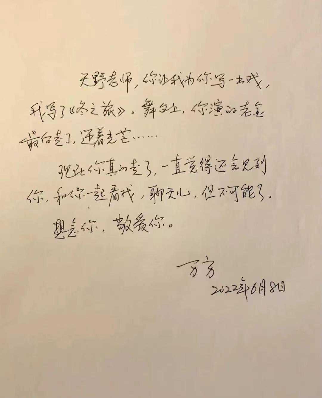 在得知蓝天野去世的消息后,万方说,“天野老师,你让我为你写一出戏,我写了《冬之旅》。在舞台上,你演的老金最后走了,迎着光明……现在你真的走了。一直觉得还会见到你,和你一起看戏,聊聊天,但不可能了。舍不得你,敬爱你。”