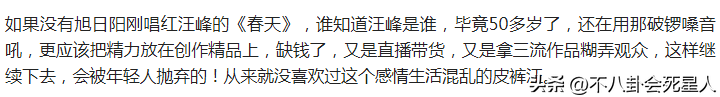 对此网友们也毫不意外,犀利点评:“娱乐节目比音乐作品优秀的汪峰,要不是旭日阳刚翻唱《春天里》,都少有人认识他.”