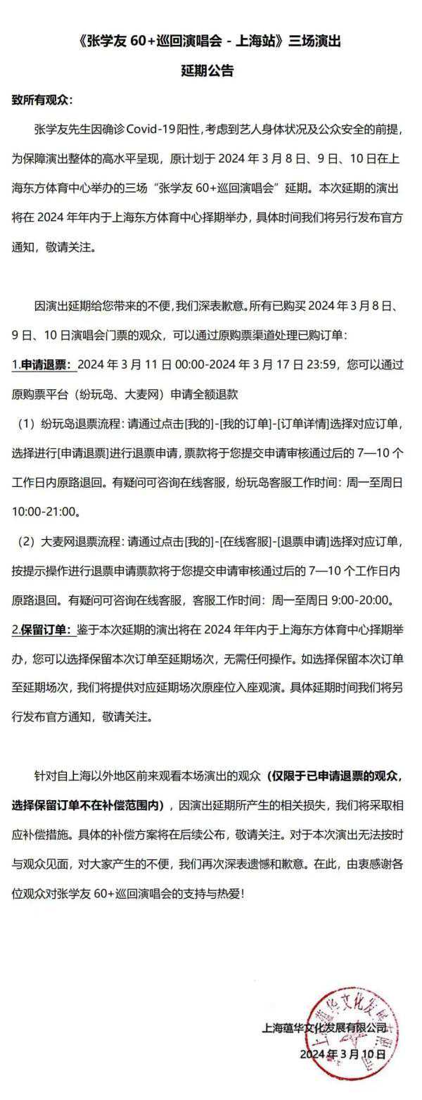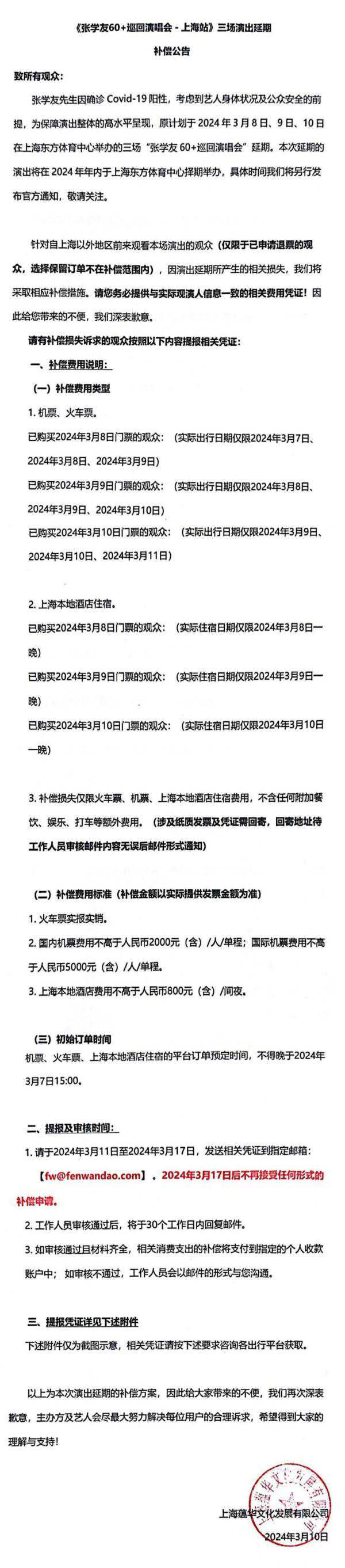 3月10日晚,主办方@CMCLive华人文化演艺发布延期公告及补偿方式,称本次延期的演出将在2024年年内于上海东方体育中心择期举办。将对已退票,来自上海以外地区的观众,补偿车票、机票、住宿等相关损失。