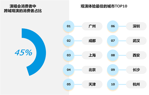 调研显示,以文促旅已成为消费新现象,跨城观演的消费者占比45%,进而带动了演出举办地的相关文旅消费。消费者满意度最高的十大演出城市分别是:广州、成都、上海、北京、天津、深圳、武汉、西安、长沙、杭州。