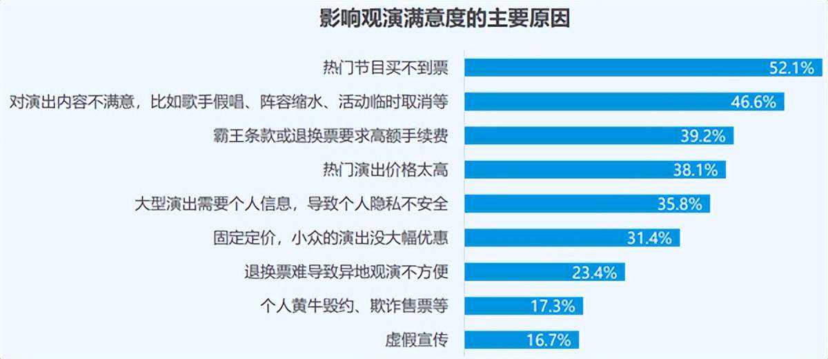 报告显示,影响消费者满意度的前五大原因分别是:一、热门节目买不到票;二、对演出内容不满意,如歌手假唱、演出阵容缩水、演出或体育赛事临时取消等;三、霸王条款,退票要求高额手续费,合理的转让或改签需求无法实现;四、演唱会等大型演出项目需要身份证、电话、人脸、姓名等个人信息,导致个人隐私不安全;五、热门演出价格太高。