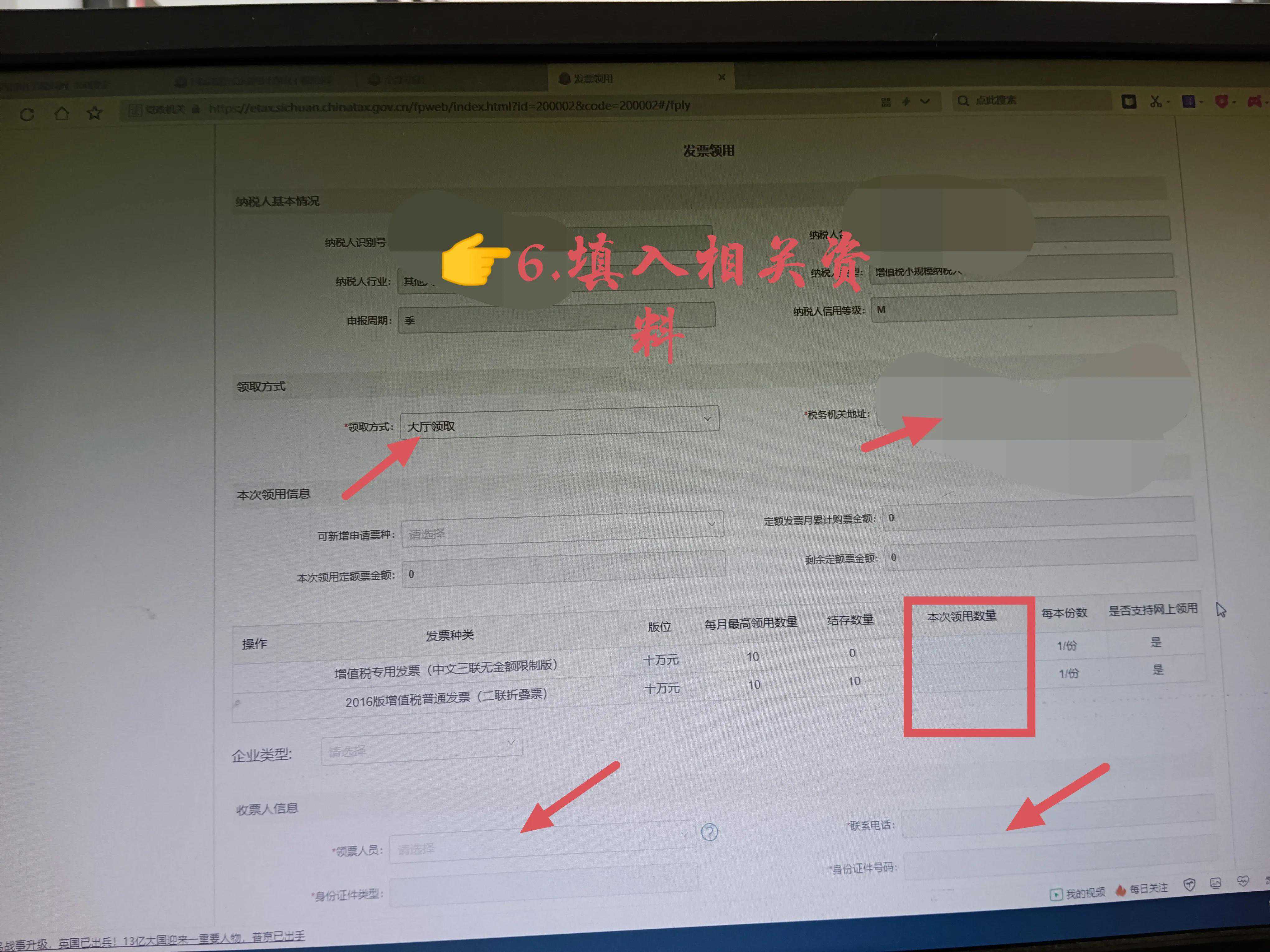 进入页面后,选择领取方式(大厅领取、邮寄领取),选择税务机关地址,填写本次领取数量(不超过每月最高领用数量),填写领票人员姓名、电话、身份证号码。