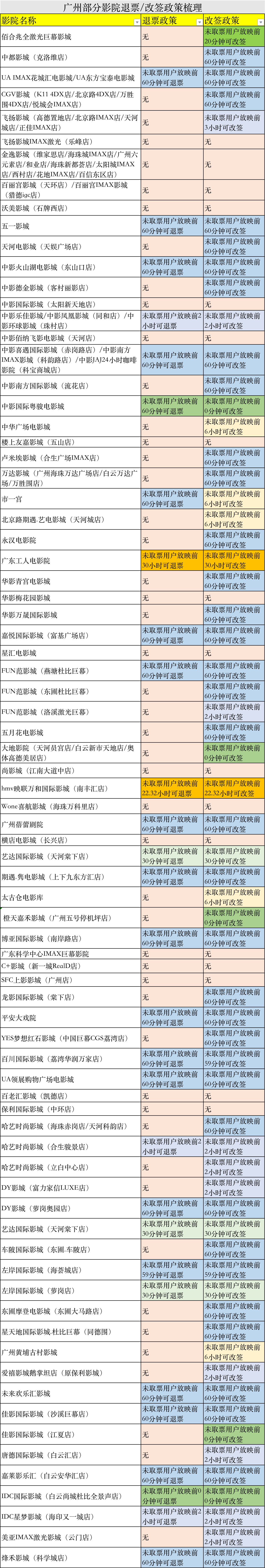 在退票政策方面,多数影院(22家)支持,未取票用户放映前60分钟可退票,如UAIMAX花城汇电影城、中影火山湖电影城(东山口店)、广州蓓蕾剧院等。1家影院(IDC国际影城(白云尚城杜比全景声店))支持,未取票用户放映前均可退票。2家影院支持,未取票用户放映30分钟前均可退票,如艺达国际影城(天河棠下店)、左岸国际影城(萝岗店)。5家影院支持,未取票用户放映前2小时均可退票。另外还有影院的退票政策比较苛刻,如广东工人电影院与hmv映联万和国际影城(南丰汇店),仅分别支持未取票用户放映前30小时/22.32小时均可退票。