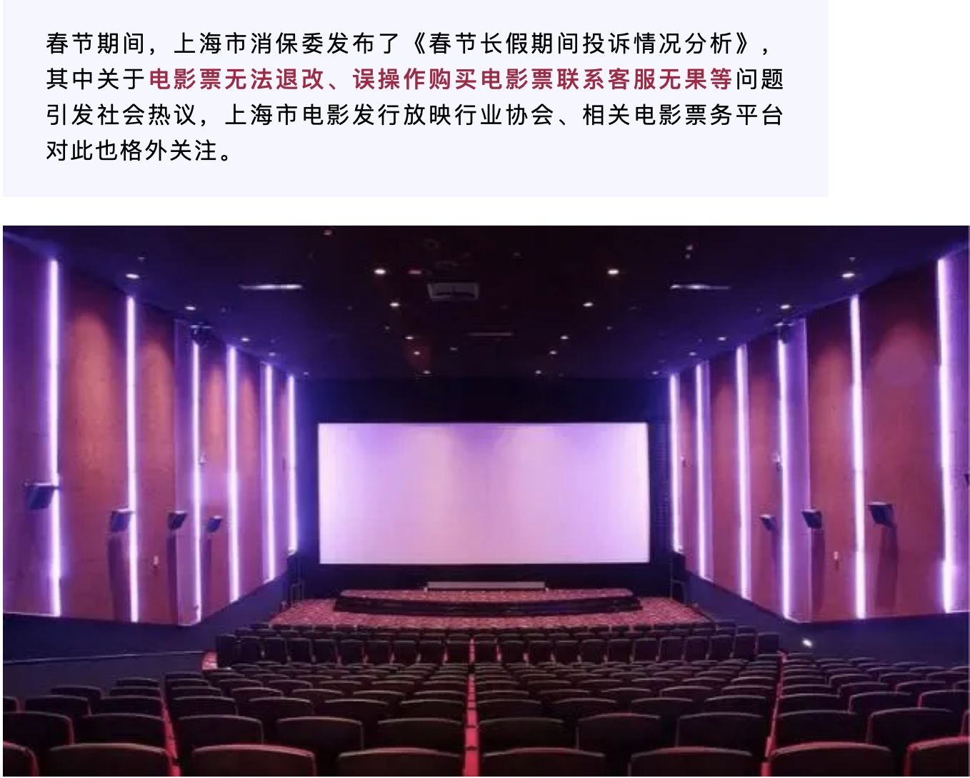 针对春节投诉中消费者集中反映的误操作退款难、影院与平台方相互推诿、自助退改页面待优化、客服响应慢等问题,上海市消保委建议票务平台:优化票务信息提示,如加粗字体,位置更显著;推出“影院、影片、场次”等信息二次确认,减少误操作可能;采取切实措施,确保电影院和票务平台在相关政策上的统一性;畅通自助在线退改签渠道,优化消费者体验;配备充分的客服人员,合理配备机器人客服和人工客服的比例,妥善处置相关投诉。