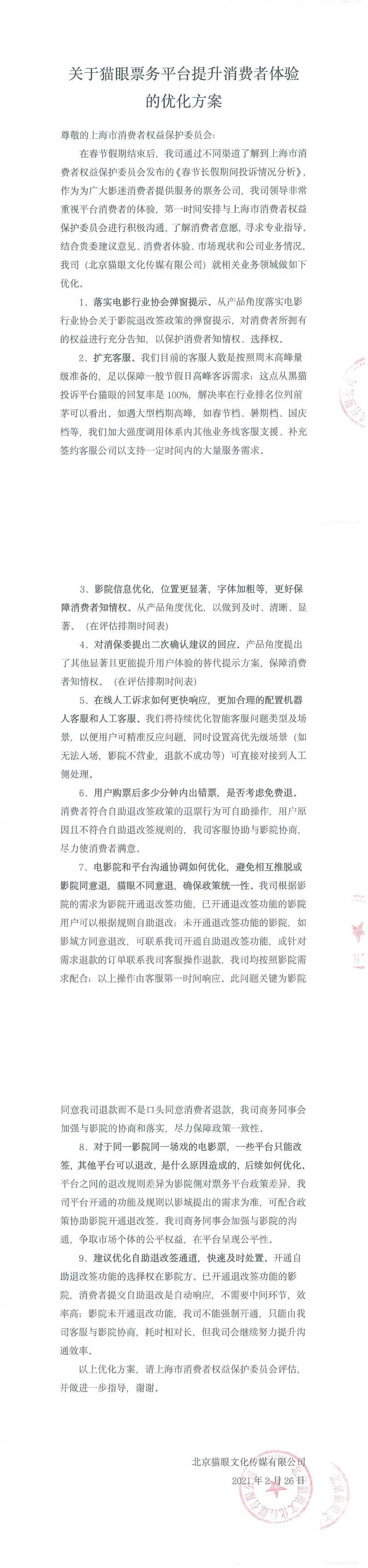 针对上海市消保委的建议,猫眼票务平台发布了提升消费者体验的优化方案。优化方案显示,猫眼票务将落实电影行业协会弹窗提示:从产品角度落实电影行业协会关于影院退签政策的弹窗提示,对消费者所有的权益进行充分告知,以保护消费者知情权和选择权。猫眼票务平台表示,对于影院信息优化及二次确认的建议,目前已经在评估产品优化排期。
