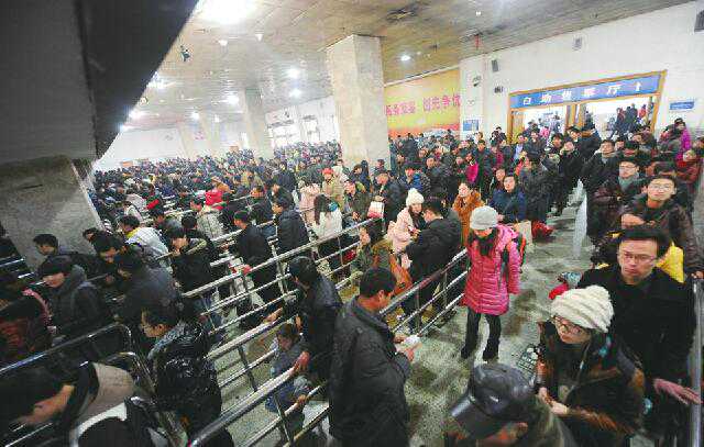 2013年1月,乘客在济南火车站售票厅排队购票。