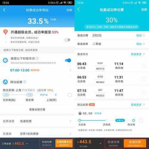 在上述八款抢票软件上,记者均预约了2月2日(腊月二十八)北京到南京的同一趟高铁,(测试时这一趟车全部坐席均已售罄,未使用加速服务、没有跨站购票),并同时备选了前后共四个班次的列车和一等座、二等座两种坐席。