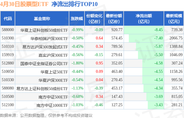 当日有635只股票型ETF基金出现资金净流出,其中净流出排首位的是华夏上证科创板50成份ETF(588000),份额减少了900.0万份,净流出额为8.45亿元。净流出排行TOP10如下: