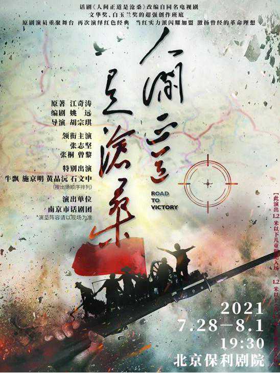 话剧《人间正道是沧桑》根据革命历史题材同名电视剧改编,以真实历史事件为故事背景和时间节点,从杨瞿两家命运更迭着手,全景式、大跨度地展现了自1925年大革命至1949年新中国成立近四分之一的世纪内,在波澜壮阔的历史洪流中近代中国各界人士探索救国救民道路并总结出“只有共产党才能救中国”的真理的故事。