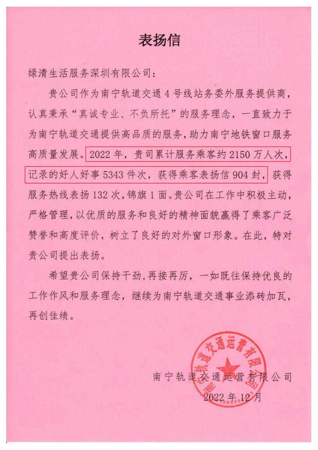什么是好服务?首先是被认可。绿清服务南宁分公司秉承“服务伙伴,绽放自己”的绿清精神,积极打造一支精干的队伍,以激越昂扬的精神面貌、专业高效的业务能力,投身于南宁地铁服务的日常工作。