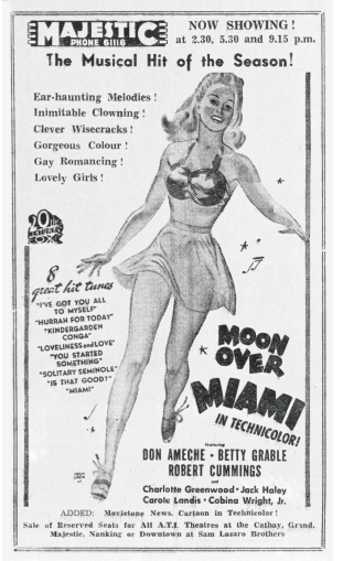 最终,二十世纪福斯出品的彩色歌舞片《美月琪花》(MoonOverMiami)中选。该片于1941年6月18日在美国上映,在交通不便捷的八十年前,仅时隔四个月,便能让上海的市民一睹为快,可算名副其实的好莱坞新片了。