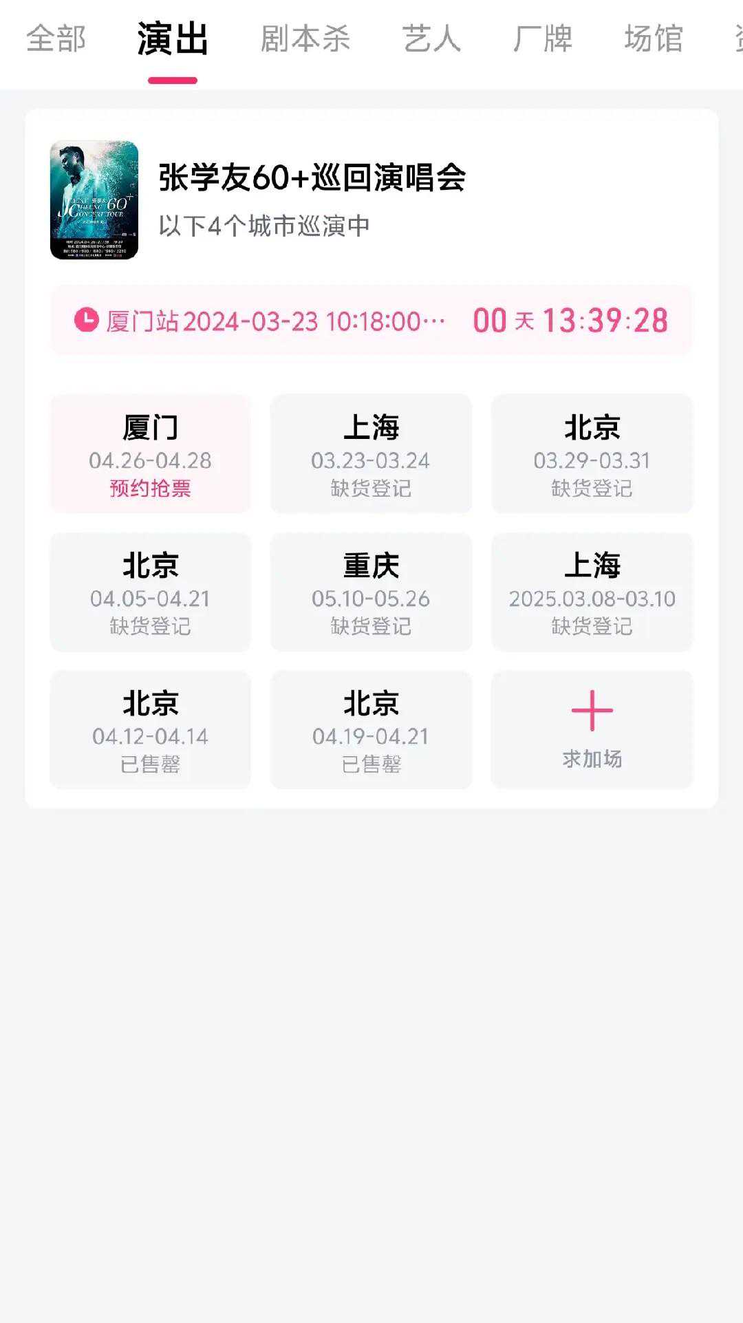 从3月29日-4月21日,即将63岁的张学友将在五棵松连开12场,时间分别是3月29日、30日、31日;4月5日、6日、7日;4月12日、13日、14日;4月19日、20日、21日。