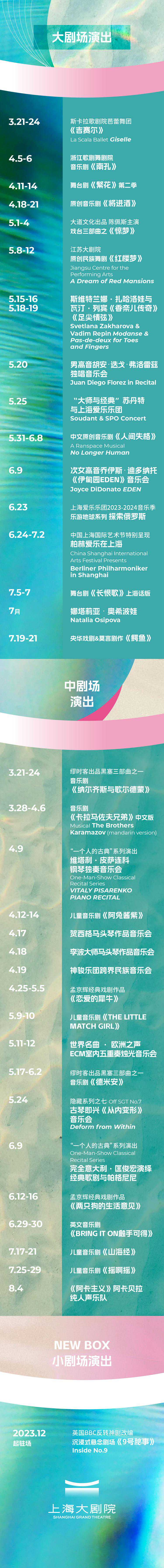 3月19日,上海大剧院发布2023—24演出季春夏篇,3月19日至8月初51台345场演出,集结意大利斯卡拉歌剧院芭蕾舞团、柏林爱乐乐团、“芭蕾女神”扎哈洛娃和奥希波娃、秘鲁男高音弗洛雷兹等名家名团,呈现独一份“上海节目单”。4个全新公共空间盘活水景资源,提升观众体验。