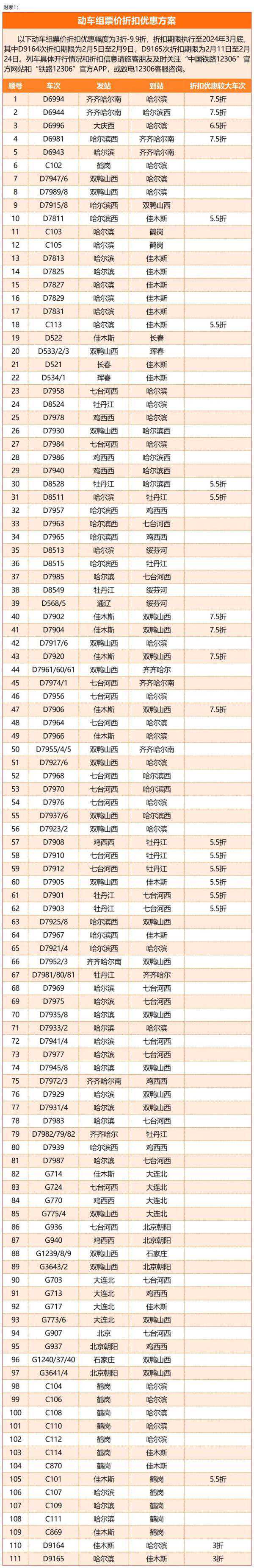 近日,中国铁路哈尔滨局集团有限公司综合运用铁路通道能力,在旅客出行非热门时段增开临客列车。同时,对部分列车加大了打折优惠力度,动车组列车最低折扣3折,让旅客得到实惠,并倡导错峰出行。