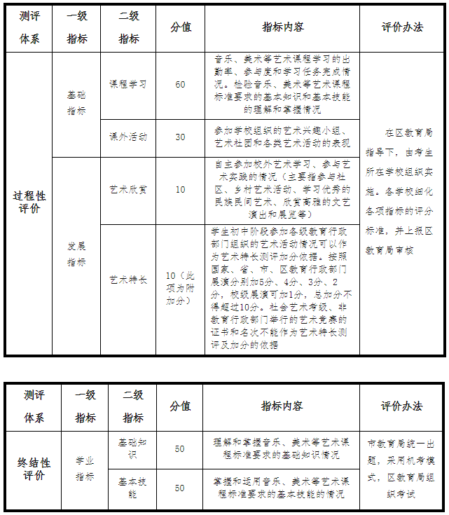 (1)过程性评价是根据学生在校参加艺术课程学习、参与艺术社团活动、发展艺术特长的情况综合评定。每学期满分100分,其中音乐、美术两科各50分。