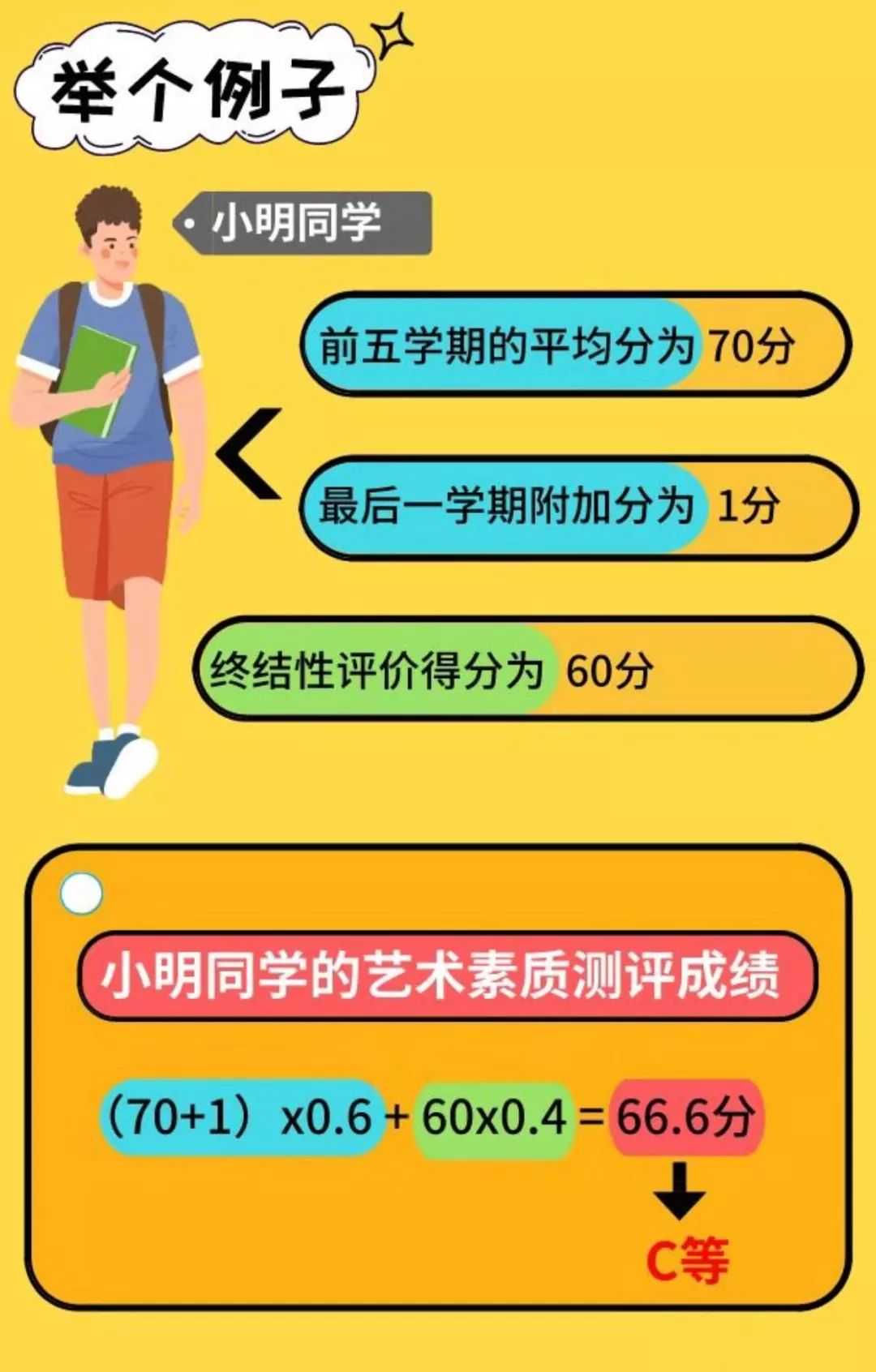 答:艺术素质测评成绩由过程性评价和终结性评价两部分组成,满分为100分,其中过程性评价成绩(五个学期的平均分+附加分)占60%、终结性评价成绩占40%。两部分成绩相加,90分以上为A等,75—89分为B等,60(含60分)—74分为C等,60分以下为D等。C等以上为合格,D等为不合格。