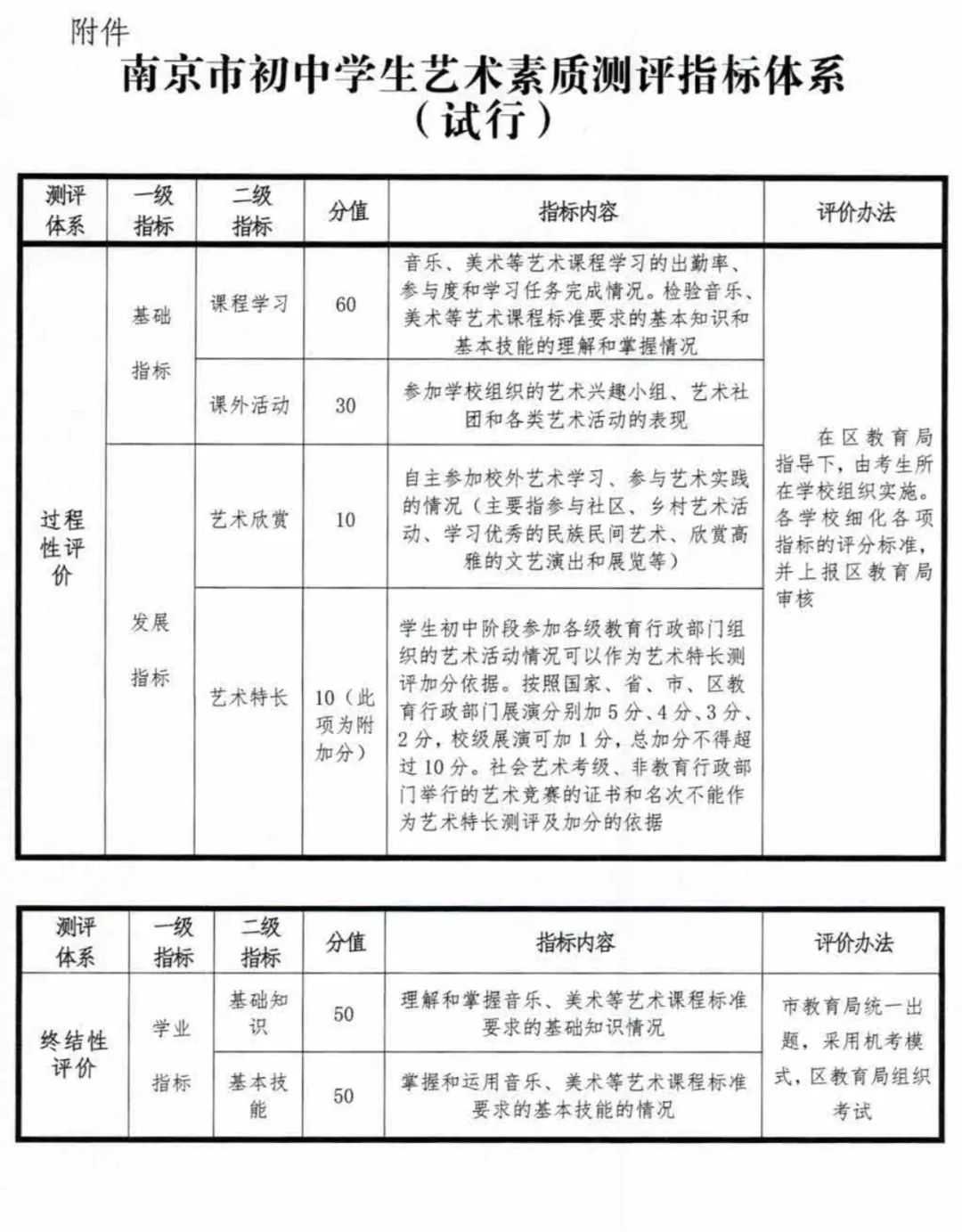 南京市初中毕业生艺术素质测评方案(试行):