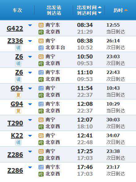 南宁部分车次显示“铺”标识。