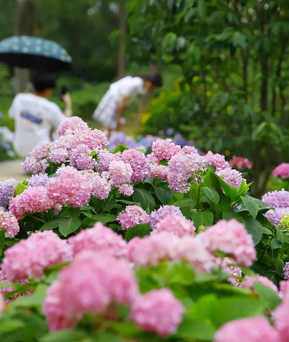 高枝带雨压雕栏,一蒂千花白玉团。初夏的几场雨过后,同心岛上一团团、一簇簇的绣球花,是南宝山献给世人的一场夏日绮梦,光影交错之间,浅粉额安吉拉、深紫的绣球、白色的小雏菊,都有它的独特韵味,一个个花球绽放在枝桠上,近观花团锦簇,远看郁郁葱葱,空气中都弥漫着淡淡的素雅清香。