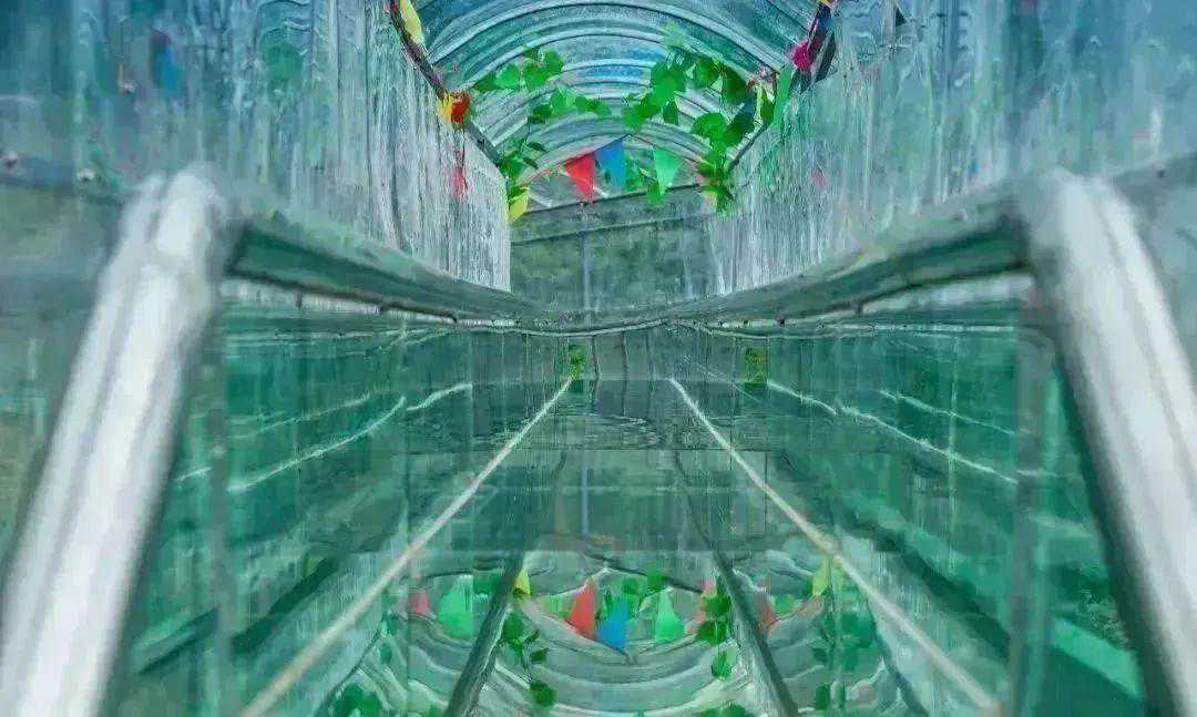 经过超长的玻璃天桥,一定感到腿软,下山可以从另一侧的玻璃滑道滑下山,这个从山顶到山脚的玻璃滑道称之为“超级梭梭板”,玻璃滑道两旁全是绿色植被,身处滑道中就仿佛进入了一个秘密的森林隧道,下滑的瞬间不仅可以享受刺激,还能欣赏美丽的丛林风光。