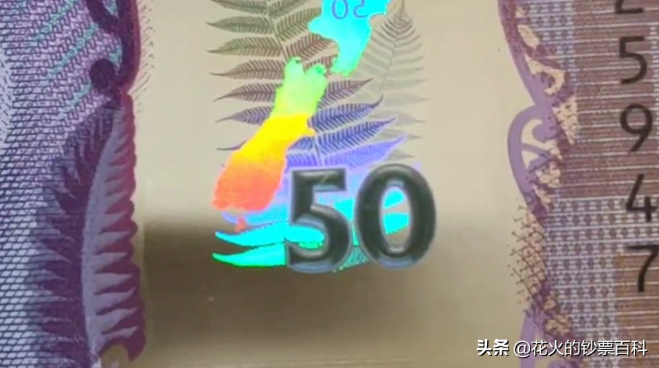 钞票右侧是带有复杂边框的大型透明视窗,窗内有金属全息防伪条,从上到下依次为:金属面额数字50和冠鸦、新西兰地图和蕨类植物、具有3D效果的面额数字50,最下面就是无色压印面额数字50。这些元素虽然纷繁但却绝不杂乱。