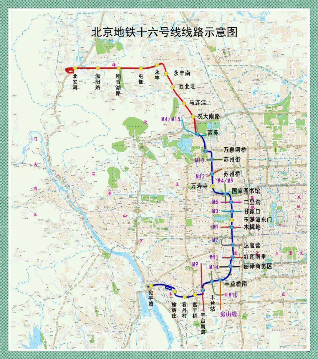 16号线中段:北起西苑站,南至甘家口站,线路全长约12公里,共设7座车站,全部位于海淀区域。其中,包含国家图书馆站、苏州街站、苏州桥站、二里沟站4座换乘站。
