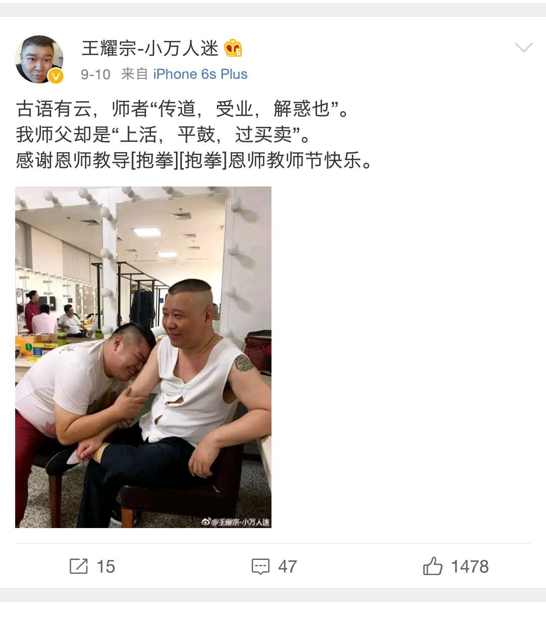 2015年7月5日,王耀宗在北京剧院举办了个人专场,发布会当时说,郭先生如果不忙会来站场。那场演出郭先生应该是出国演出,终究还是错过了,我想王耀宗当时心里应该会有一些失落,我有段时间天天看他微博,能感觉的到,他真心喜欢自己的师父。