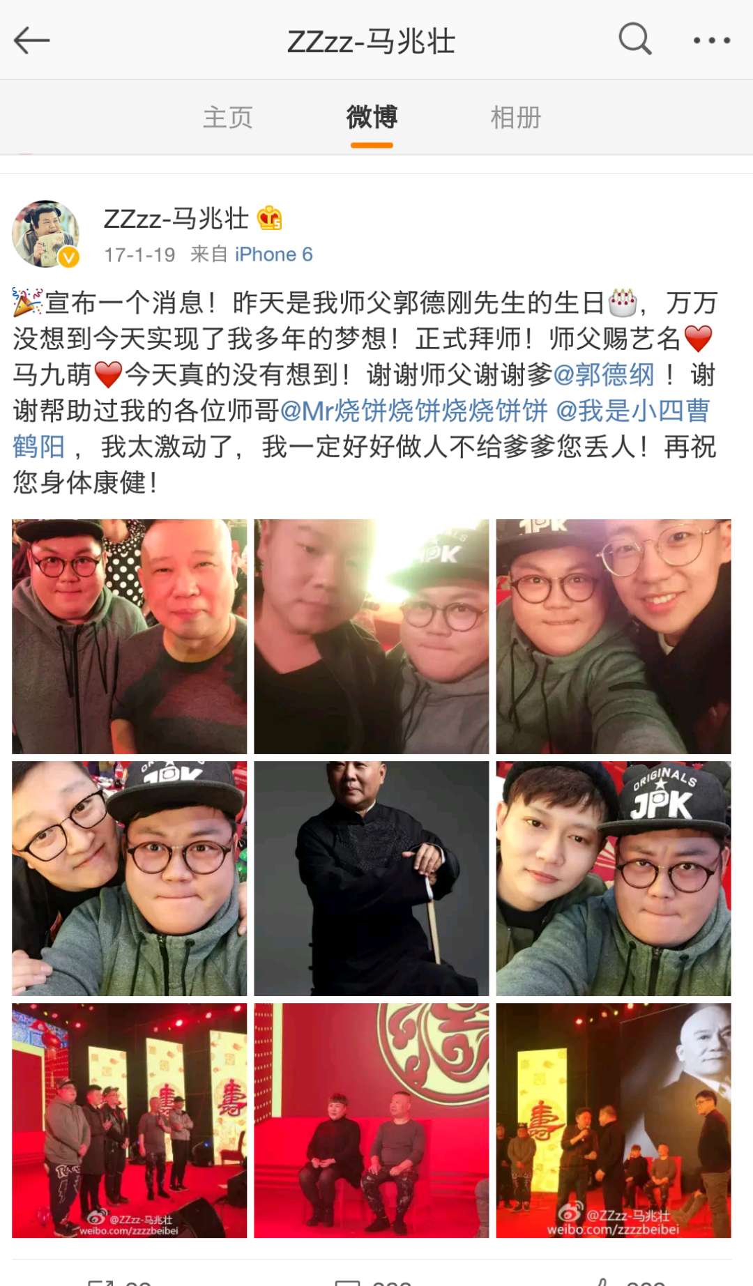 上文提到郭先生在湖北卫视《我为喜剧狂》一共收了两个徒弟,除了“黑熊怪”王耀宗,另外一位就是纲丝马兆壮,艺名“马九萌”。为什么说他是纲丝马兆壮,因为他是很多纲丝羡慕的对象,他本人就是从一名纲丝成了郭先生的弟子。