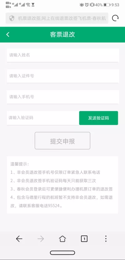 此外,春秋航空提供了自助改退签链接,旅客输入网址。